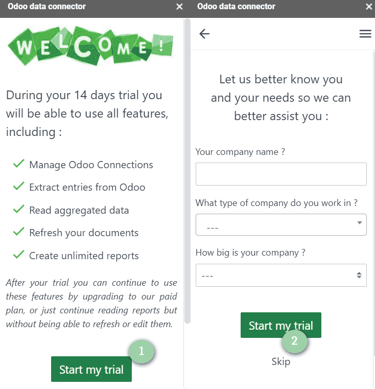 Once installed from the marketplace, you can start to use the plugin. There is no additionnal addon to install on Odoo, or any special configuration to be done, it works on every major versions of Odoo.