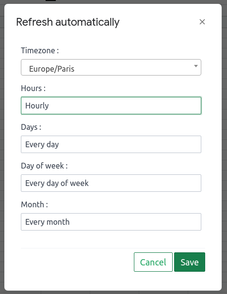 Warning : You can not chose the minuteat which the update is triggered, Google automatically schedules this parameter. Once initialized every task will trigger generally at the same minute. - Days : You can set a fixed day in the month. For example only the 7 first days of the month.